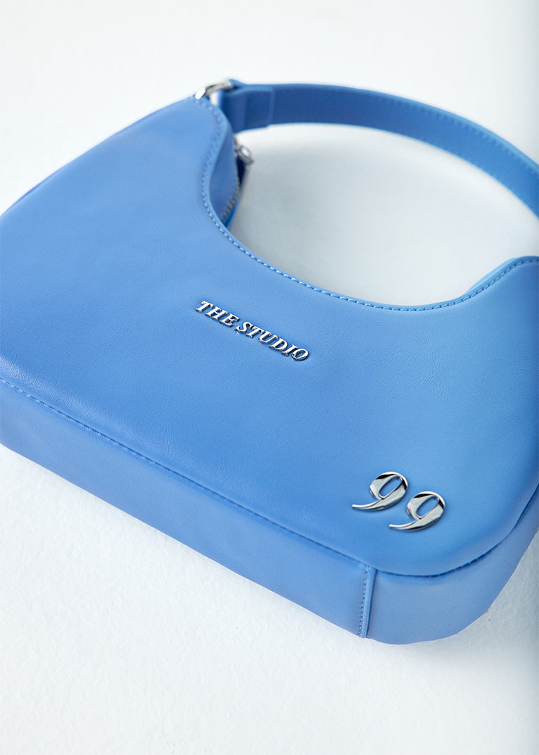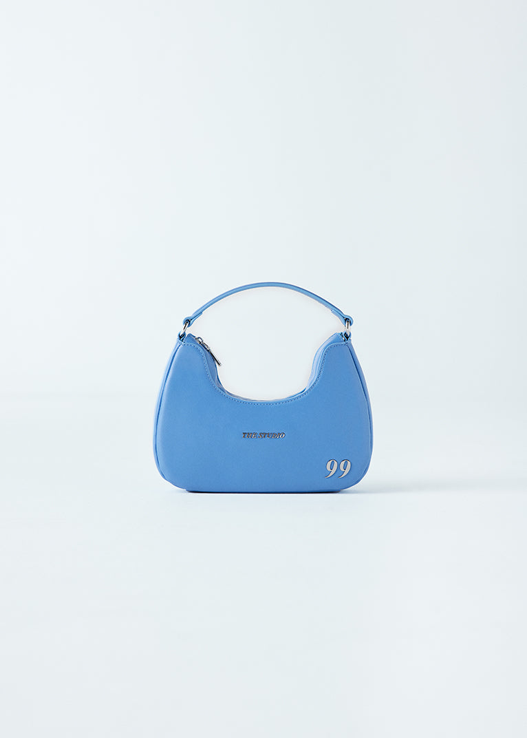 Sky Blue Vegan Leather Handbag with stainless steel "99" logo on the front. Zip closure. Top Handle with stainless steel on the sides. Internal pocket.